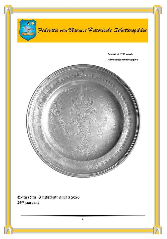 In dit extra nummer brengen wij een uitgebreid en diepgravend artikel met als titel "Eeuwenoude tinnen schotels van schuttersgilden uit de Zennevallei vóór 1830". Auteur Karsten Vandebotermet, gepassioneerd verzamelaar en kenner van het gebruik van tin binnen gilden en bijhorende plechtige gelegenheden, publiceerde reeds meerdere bijdragen over dit vaak onderbelichte, maar bijzonder waardevolle aspect van ons schutterserfgoed.